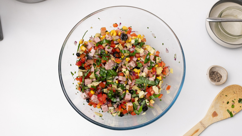 - Add the diced ham, red pepper, red onion, tomatoes, artichoke, corn, black olives, basil, and chives to a large bowl.