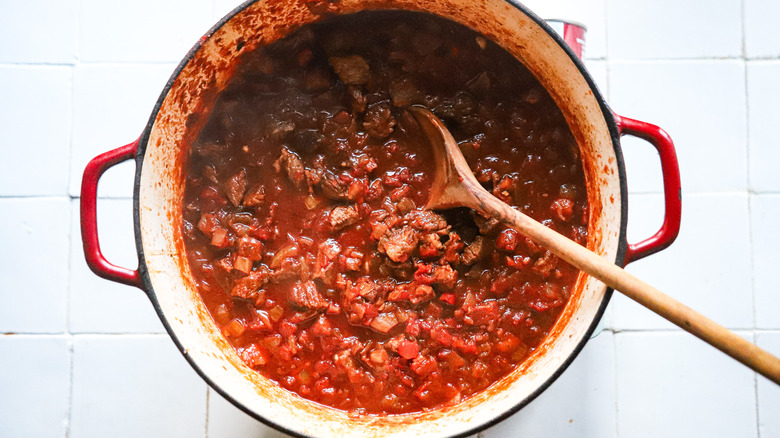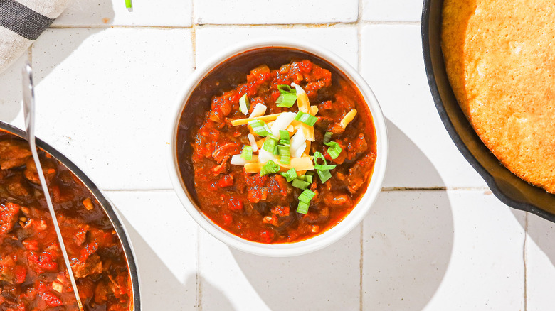 Whether preparing a solo meal or a giant pot to share with party guests, chili is always a top-notch choice. It doesn't matter if you prefer beans and tomatoes or how spicy you take it, there's a chili recipe to satisfy everyone with plenty of options to customize and elevate the taste. For example, if you're looking for a protein-rich pot of goodness filled with extra-smoky notes of flavor, look no further than a smoky brisket chili recipe to bring both the heat and the meat. Brisket makes an excellent protein base or addition to your chili for its heartiness and taste. You can either make a chili-specific brisket or repurpose leftovers to prevent food waste. Either way, it's going to be delicious.