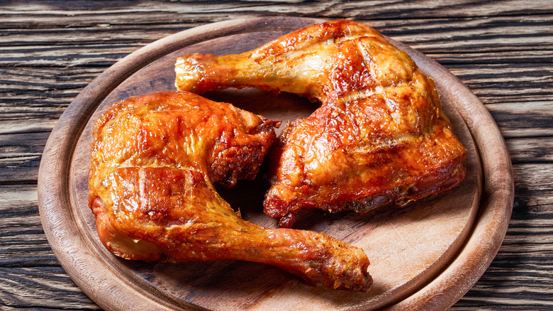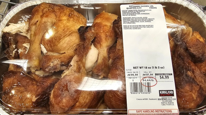 Thanks to the carnivorous Costco community on Reddit, we now know to look out for rotisserie chicken leg quarters the next time we hit the deli section. As Reddit user u/BuonaDomenica documented in a post in r/Costco in 2023, some locations of the grocery chain sell the rotisserie chicken legs as a prepackaged item, with an eight-count of quarters (i.e. over a pound of meat) also ringing in at just $4.99. "The meat falls off very easily if you microwave a leg quarter for two minutes," the Redditor wrote, adding that they were available at the Costco in Palm Desert, California, almost daily. However, it seems that the quarters are more difficult to find than the rotisserie chickens themselves.