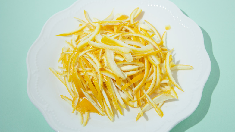 Candied lemon peels are a simple recipe that everyone should have on their radar — especially if you find yourself constantly needing fresh lemon juice. You can easily save your lemon (and other citrus) peels for this sweet and sour treat. The peels first need to be blanched in water to remove some of the bitterness before they can be cooked down in a batch of simple syrup. This process gives the strips a sweet sugar coating, which can be made more textured by rolling them in granulated sugar after they're done cooking. You'll often see candied lemon peels used as a garnish for a lemon-glazed pound cake or as a whimsical topper for boozy beverages. But, you can also use lemon peels to add a unique flavor and texture to your next fruit salad.