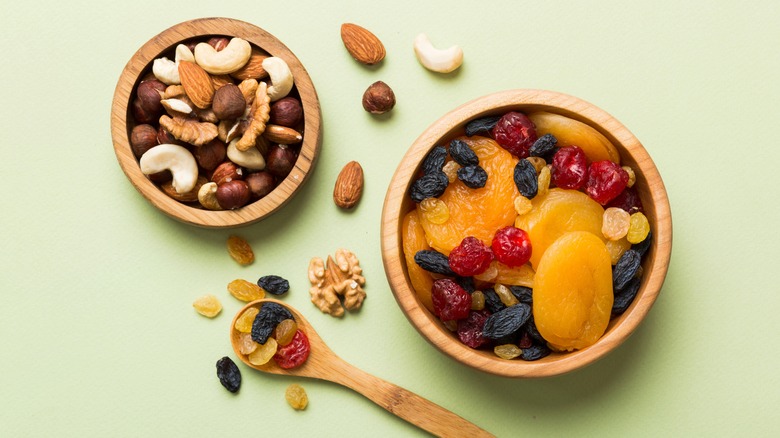 The flavors of charcuterie boards don't need to be reserved for pretty dinner party displays and organized spreads presented at happy hour. If an ingredient belongs on a charcuterie board, it can make its way into your next snack mix. Instead of slicing up sausages to serve on a wooden cutting board, you can whip up a batch of homemade beef jerky to cut into bite-sized pieces to add to your charcuterie-inspired snack. Cheese crisps and cheese crackers can replace the usual assortment of charcuterie cheeses, while dried fruits like raisins, blueberries, dates, and figs can substitute the fresh pieces you'd set onto platters for guests to grab.