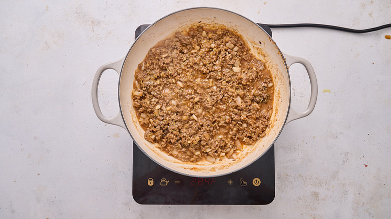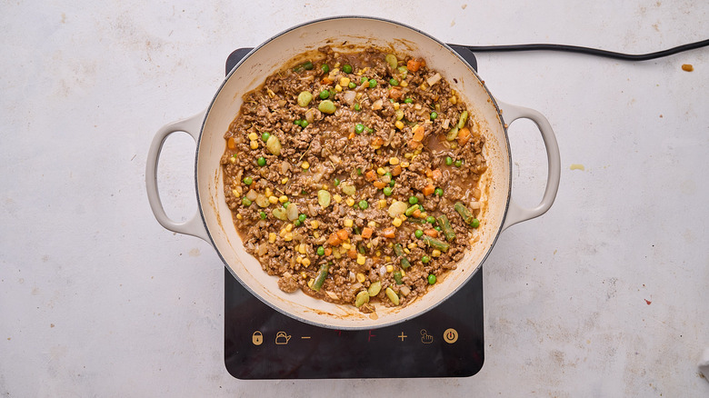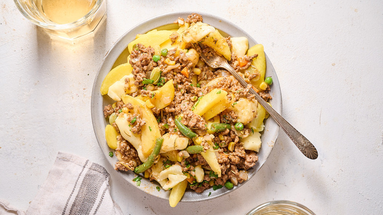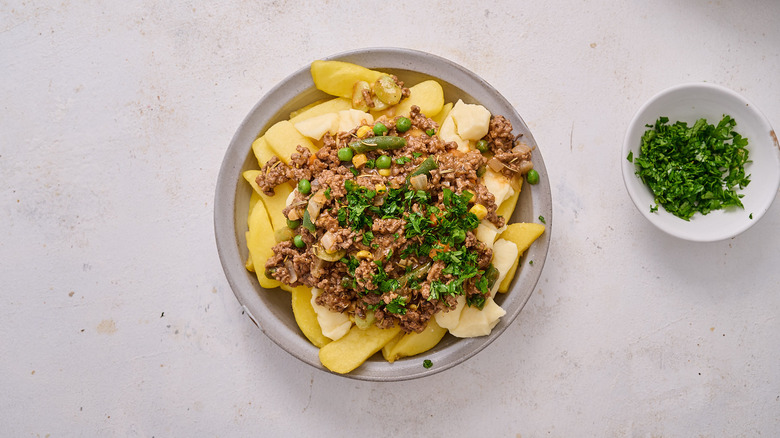 Shepherd's pie is a creation from the other side of the pond, somewhere between Ireland and the U.K. Technically made with lamb mince but considered interchangeable with cottage pie's beef, the "pie" is made up of a vegetable and meat–filled gravy and warm mashed potatoes. You might have caught the similarities between the two dishes: Both potato-based and full of gravy, shepherd's pie and poutine make for the ultimate dish when they're combined into one. In this recipe from developer Michelle McGlinn, crispy french fries and a ground beef gravy topped with warm, gooey cheese curds bring the best of both dishes together. Made for fun, messy nights, this is a quick and easy dinner that is hard not to enjoy, no matter your age.