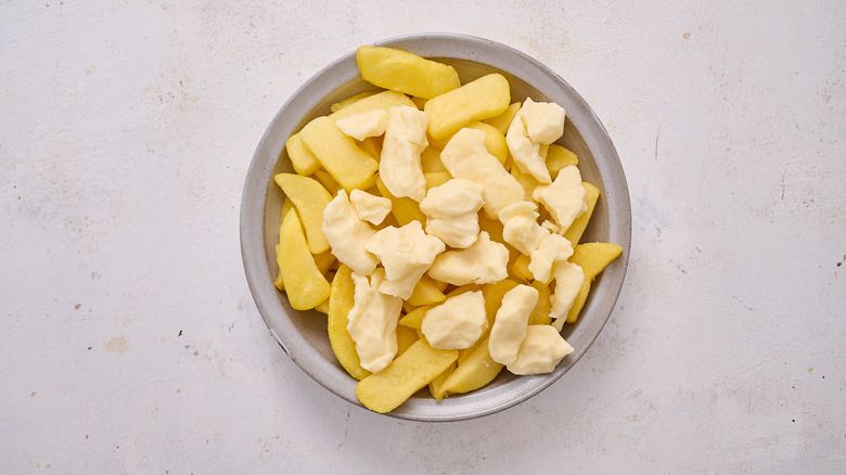 You may have only heard of cheese curds if you've spent time in Canada, the birthplace of poutine, or Wisconsin, America's dairyland. An essential part of poutine, cheese curds are rubbery, squeaky pieces of young cheddar that melt exceptionally well with heat. In Wisconsin, it is typical to fry the curds, resulting in an epic cheese pull that can stretch up to 2 feet. In Canada, the curds are used in a much more straightforward way; they're simply added on top of French fries for a slightly melted, super-gooey poutine.