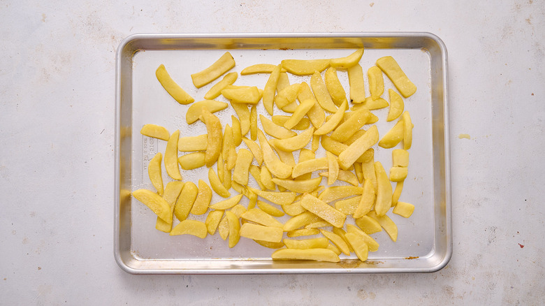- Arrange the french fries on a sheet pan and drizzle with 2 tablespoons olive oil.