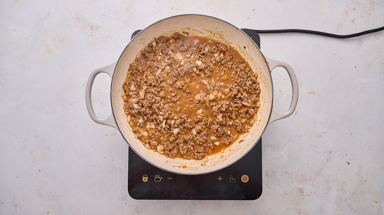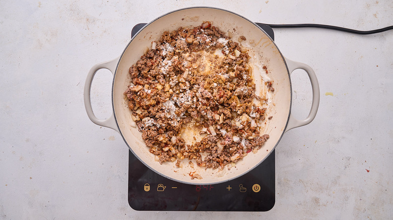 - Once the flour is incorporated, add the Worcestershire sauce and beef broth. Stir well to combine.