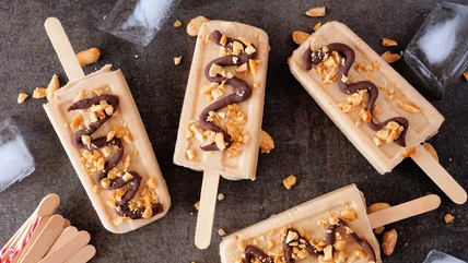 Greek yogurt is ideal for this recipe due to its thick texture and high protein content. It'll also add a slight tangy taste to cut through the richness of the peanut butter and chocolate. To make these bars, simply blend the nut butter and yogurt together in a mixing bowl until well combined. Then, you can either stuff the filling into popsicle molds or loosely form globs around a wooden popsicle sticks on a parchment paper-lined baking sheet. Place the bars into the freezer to firm up for a few hours. Then, melt chocolate with a bit of coconut oil to create the chocolate coating for your bars. Dip the frozen bars into the melted chocolate, place them back onto the baking sheet and freeze for another four hours or more.