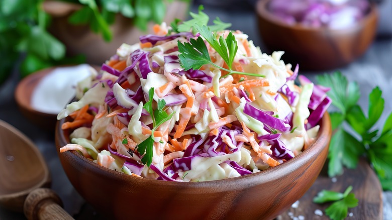 Mayonnaise makes up a good portion of coleslaw dressing, so choosing a good tasting brand is important (note: low-fat mayonnaise can also be used). Some variations replace half of the mayonnaise with sour cream for a thicker, richer result. Others suggest using plain Greek yogurt instead for a lighter but tangier option. Be sure to use Greek yogurt and not regular yogurt if going that route.