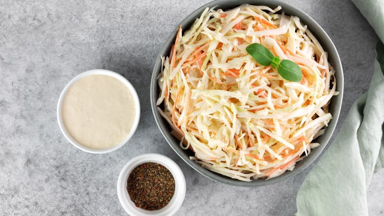 The other major ingredient in coleslaw dressing is vinegar. Apple cider vinegar is the most popular choice, although other variations like white wine vinegar or red wine vinegar will work too. Typically, the ratio is 2 tablespoons of vinegar for every cup of mayonnaise. From there, it can vary quite a bit. The addition of lemon juice will give it more bite and tang. Meanwhile, Dijon mustard or peppercorns can give it a hint of heat. Other popular additions include honey, poppy seeds, and celery seeds.