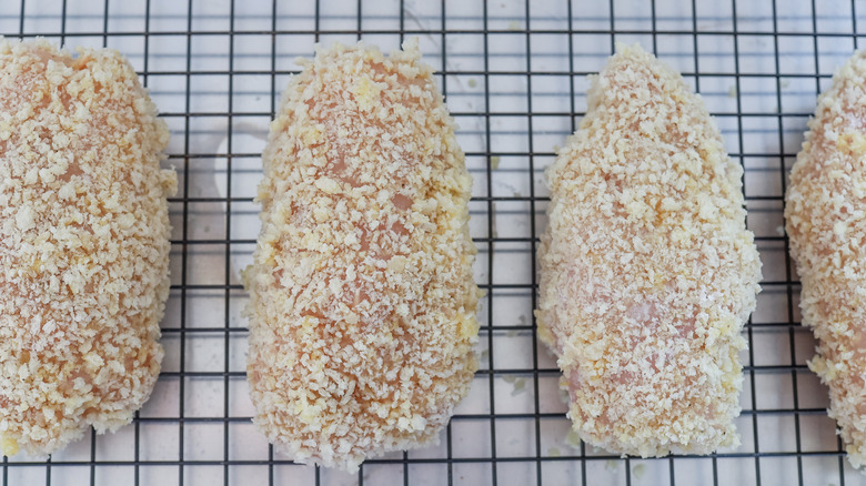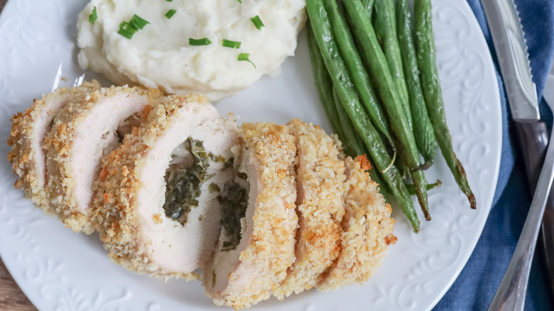 When butterfly-cutting your chicken breast, use as few cuts as possible. This will help the chicken Kiev maintain its shape after it's stuffed to the gills with creamy, herby butter. Speaking of the filling, once it's all mixed, you'll want to keep the butter in the fridge for at least two hours to make sure it thoroughly firms up. After wrapping your chicken breasts around the butter and securing it all with toothpicks, some chefs like to toss the unbaked chicken Kiev in the freezer for 15 minutes to ensure the butter doesn't come oozing out once you heat the chicken up.