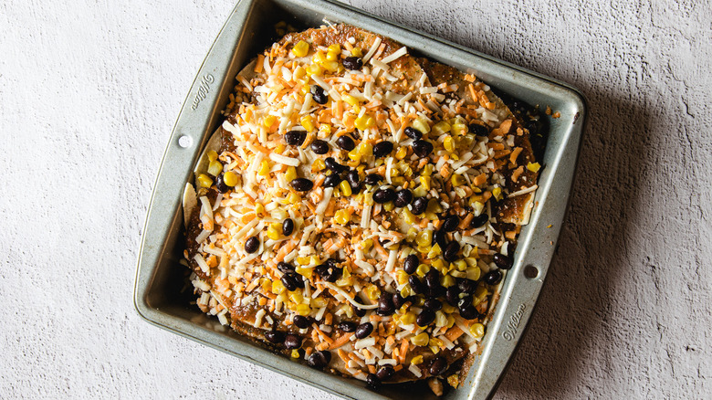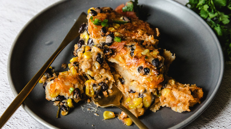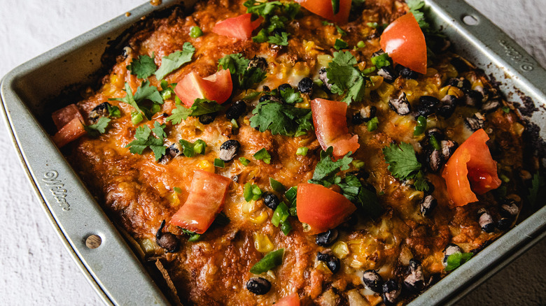 There's no shortage of ways to take this Mexican-inspired casserole to another level, from crunchy toppings to more veggies and even meaty vegan crumbles hiding between the layers. Beyond black beans, try other types of beans, such as pinto, kidney, or refried beans, for added protein and variety. Adding other chiles, either mild poblano to chipotle or ancho peppers, will introduce more smokiness and heat to the salsa.
