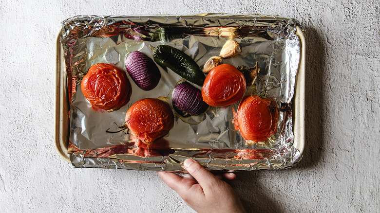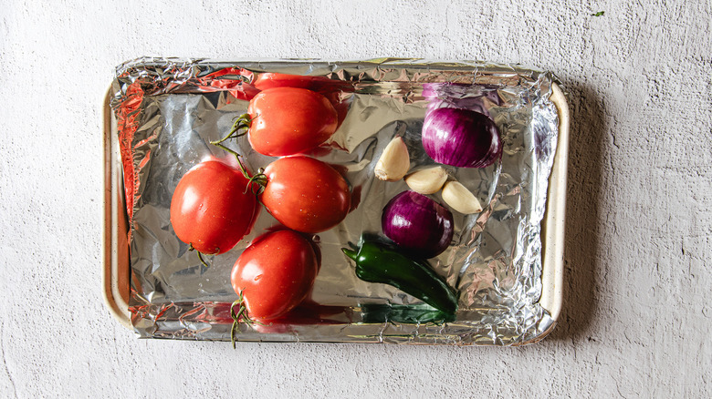 Arrange the tomatoes, onion, garlic, and jalapeño on one baking sheet.