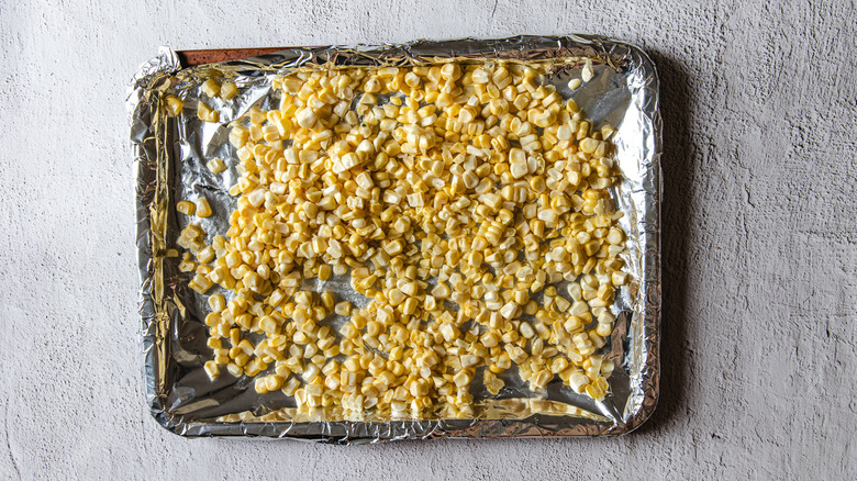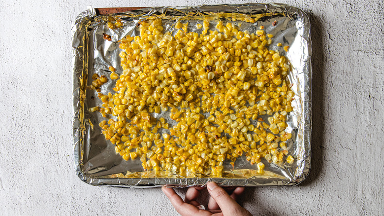 - Meanwhile, toss the corn kernels with 1 tablespoon canola oil and spread them on the other baking sheet.