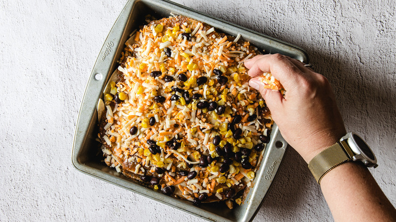 - Add 2 tortillas to the bottom of the pan, then layer on ½ cup of the black bean-corn mix, ⅓ cup of the salsa, and ⅓ cup cheese. Repeat the layers 2–3 times, until you run out of salsa and have used three-fourths of the corn mixture and cheese.