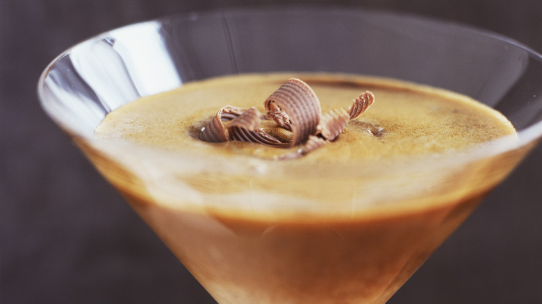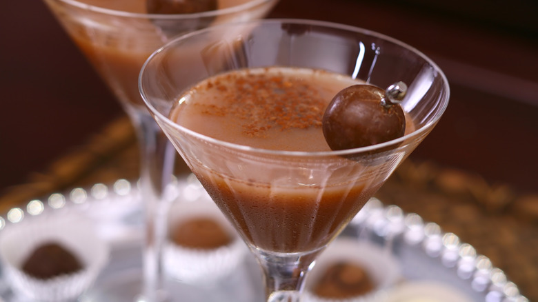 Meanwhile, crème de cacao is a famed chocolate liqueur, a crucial ingredient in the chocolate martini, Brandy Alexander, and Grasshopper cocktails. It's made from raw cocoa beans, usually distilled in vodka or a neutral grain spirit at 20% to 25% ABV. Either dark or white crème de cacao (there's a difference between 'em) will work for a bourbon ball cocktail — whatever you're rockin' with in your home bar is totally fine. Just know that your selection will slightly alter the color of the drink.