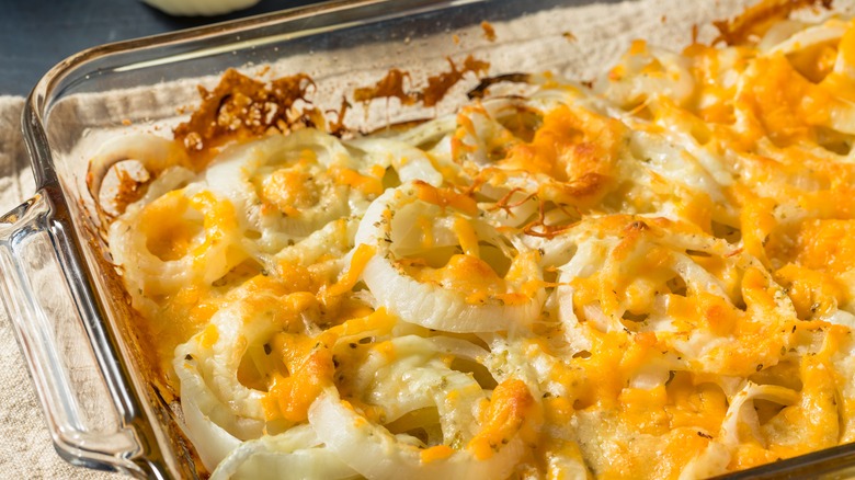 If you want to take your Tennessee onion casserole up a notch, give your dish a squeeze of fresh lemon juice to brighten it up and mellow out the intense onion flavor, which can get a little overwhelming when it's the main ingredient. Or try swapping out the shredded cheddar for your favorite gooey cheeses. Gruyere, for example, adds a nice creaminess to the dish, while parmesan gives it a subtle nutty crunch. "Virtually any cheesy combination would work well with versatile onions," Le Moing says. For an unexpected twist, add a few thin tomato slices before roasting, broil mozzarella on top, then sprinkle with ribbons of basil and drizzle with balsamic. Just don't tell Tennessee what you did.