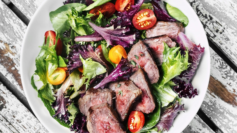 Whether you're making dressing from scratch or using your favorite store-bought brand, odds are it contains an acidic ingredient, a fat, and flavorful seasonings like mustard, honey, aromatics, herbs, and spices. You can simply reserve a portion of the salad dressing to pour over the meat or plant-based protein you'll use to top your salad. The salad dressing will season the meat with the same ingredients that tie the salad together, making for a more cohesive dish.