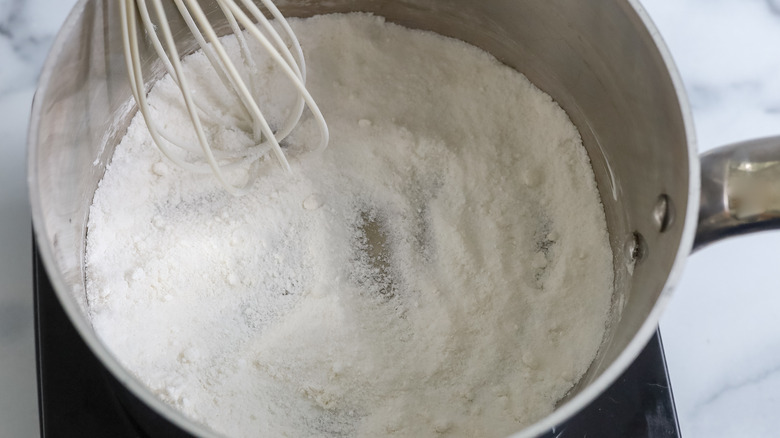 - Make the pastry cream: In a medium saucepan, whisk together the sugar, cornstarch, and flour until combined.