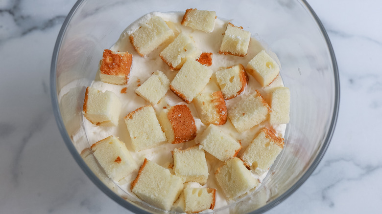 - Arrange a layer of pound cake cubes in a single layer on the whipped cream.