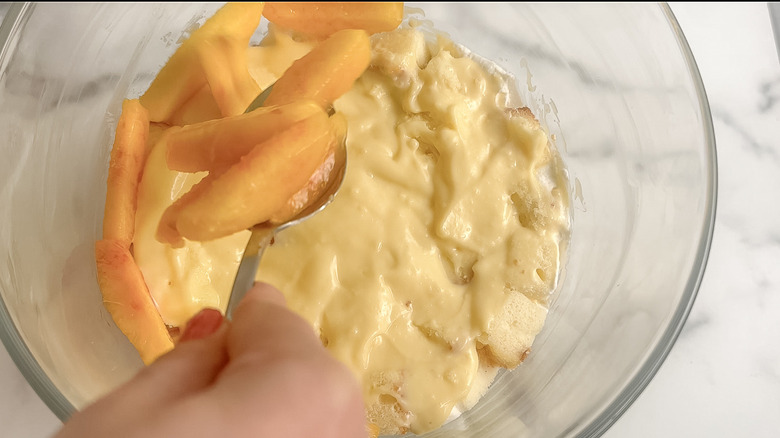 - Press peach slices around the sides of the bowl, then spoon more peach slices over the pastry cream in an even layer.