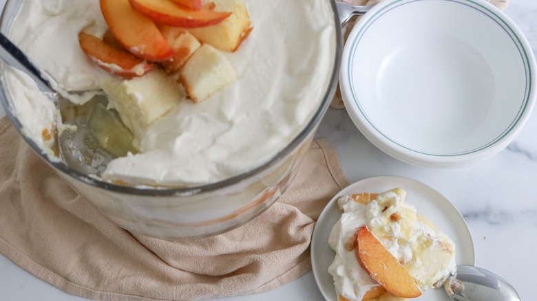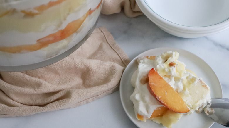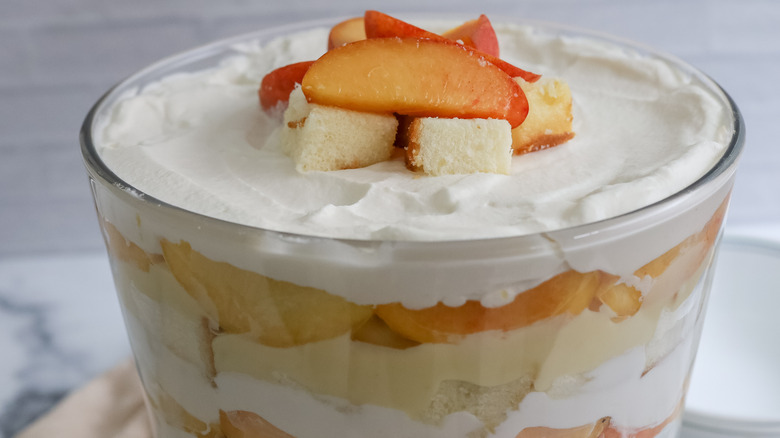 - Repeat the pattern with more whipped cream, cake cubes, pastry cream, and another layer of peaches. Top with the remaining whipped cream. Add some more decorative cake cubes and peach slices on top, if desired.