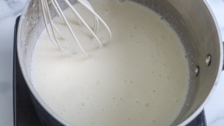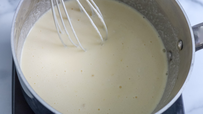 - Place the saucepan over medium-low heat and whisk constantly until it begins to boil. Let it boil for about 15 seconds, until it becomes thick.