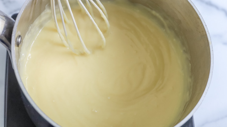 Pastry cream can be a bit challenging to make because it requires precise temperature control and constant attention to avoid curdling or the forming of lumps. The cream thickens quickly, so even a slight lapse can lead to a grainy or scrambled texture — it can even burn if you cook it too long. There are a few tips that you can use to make perfect pastry cream. The first tip is to use a heavy-bottomed saucepan to distribute heat evenly. The second tip is to whisk the cream constantly while it cooks to keep the temperature even and the cream nice and smooth. Also, since overcooking is the biggest mistake you can make with pastry cream, cook the cream just until it thickens enough to coat the back of a spoon. Straining the cream through a fine sieve can also help remove any small lumps.