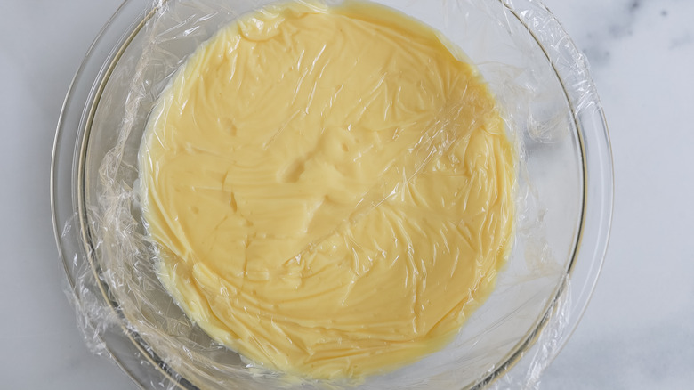 - Transfer the pastry cream to a clean bowl, place a piece of plastic wrap directly over the surface of the custard to cover it, and refrigerate for at least 3 hours, until thoroughly chilled.