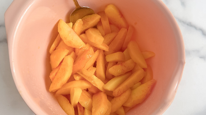 - Make the peach layer: In a medium bowl, combine the sliced peaches and lemon juice. Set aside.