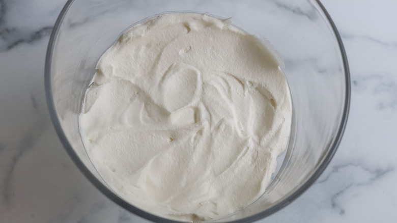 To assemble the trifle, spread one third of the whipped cream evenly in the bottom of the trifle bowl.
