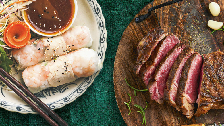 You can get creative and make your own rendition of steak summer rolls, or adapt one of Tasting Table's recipes to use the extra meat. For example, this vibrant summer rolls recipe features fillings including avocado, cucumber, mango, and bell peppers that all pair well with your leftover steak. A more savory take is to try these fresh and fragrant Thai basil beef rolls and swap the ground beef with the extra steak in the fridge, chopped or sliced up finely. Both recipes include sauces, one homemade and the other store bought, for dipping purposes. You can also try this spicy peanut sauce recipe if those dipping options don't work for your spread. You want to keep the ingredients inside the rolls dry, then just dip into your chosen sauce with each mouthful.