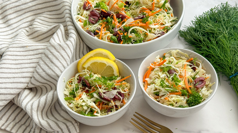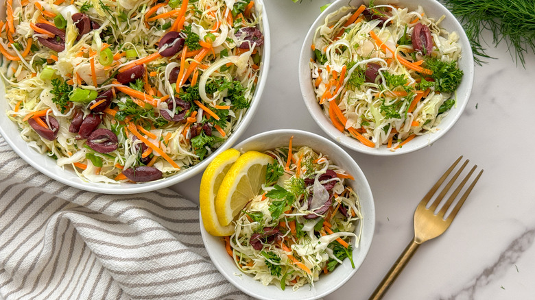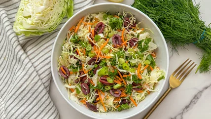 When thoughts of a tangy Greek salad are dancing around in your head, but you're craving some extra crunch, this lahano salata recipe is the answer. Lahano, which means cabbage in Greek, adds a hearty twist to the standard Greek salad with the same great flavor, lots of crunch, and the simplicity of Mediterranean cuisine. The combination of fresh, earthy parsley and dill, zesty green onions, sweet shredded carrots, briny kalamata olives, and a bright lemon dressing delivers a refreshing salad bursting with the taste of Greece.