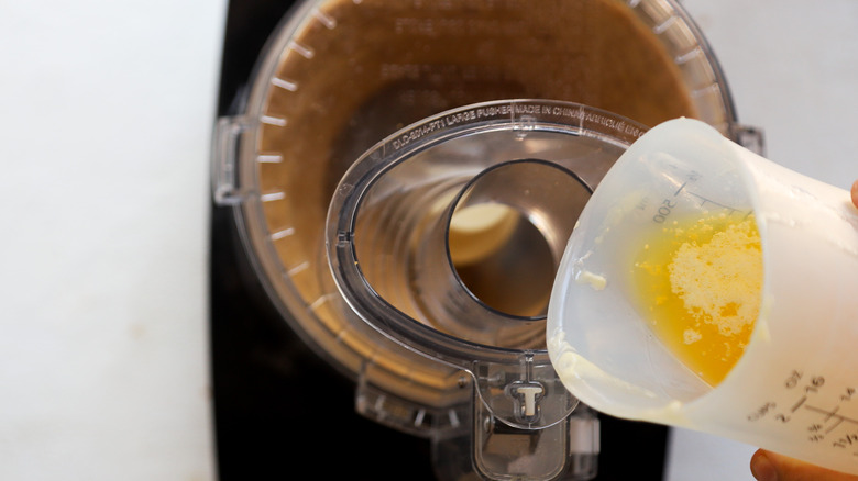 Drizzle in the butter and blend until the mixture resembles coarse sand.