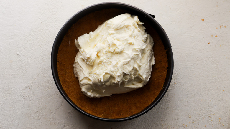 The crust is a simple and traditional graham cracker crust that's blended with brown sugar and melted butter and then frozen until stiff. To incorporate the apricot, we use apricot jam. You can swap this with any kind of fruit jam, either from the store or homemade.