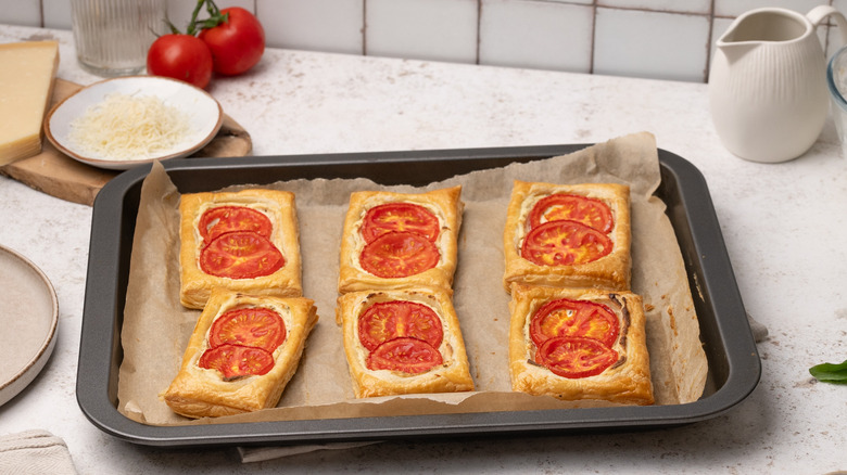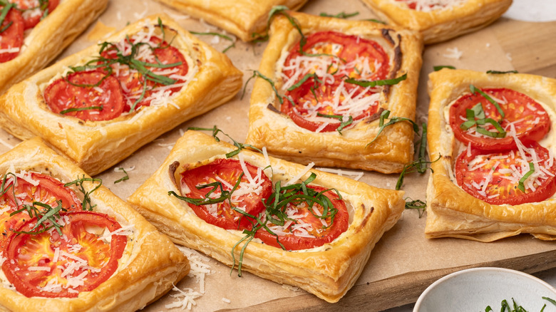 While Danish pastries are commonly sweet and delicate breakfast treats to pair with your morning coffee, you can take them in a savory, dinner-worthy direction by swapping fruit filling for umami-rich tomatoes and herbs. In her recipe for cheese and Italian herb tomato danishes, Tasting Table recipe developer Jennine Rye builds her puff pastry with Parmesan and herb infused cream cheese and juicy tomato slices.