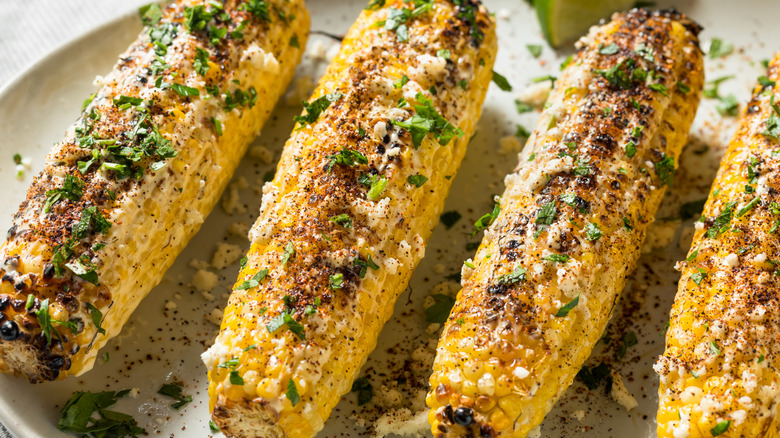 While they are similar dishes, both often referred to as "Mexican street corn," there are differences between elote and esquites, mostly in the assembly and presentation of the dishes, although their ingredients are similar. Elote is served as a whole ear of corn, while esquites are usually served in a cup with a spoon. For Mexican street corn-inspired deviled eggs, there are a few essential ingredients to change. Swap the crème fraîche for sour cream or the classic crema Mexicana, and exclude Dijon mustard and black pepper. Make sure to be generous with the mayonnaise and lime juice. Use chopped fresh cilantro in place of fresh dill, and you can even garnish each finished egg with a single cilantro leaf if you're feeling fancy.