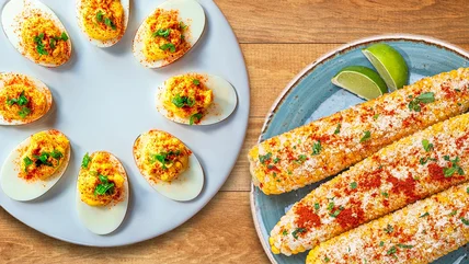 Like many everlasting staples of modern society, deviled eggs have their origins in ancient Rome, and the dish has continued to evolve over centuries. Deviled eggs are a popular party food across the country, from pastel-hued Easter brunch appetizers to DIY deviled egg bars, due to their range of creative variations and the fact that they can be made a few days ahead of time. Start with a classic, easy deviled eggs recipe as a base to build and expand upon. Once you have the basics of deviled eggs down, you can play around and experiment in any way you like. For example, take inspiration from our grilled Mexican street corn recipe and give deviled eggs a major upgrade by leaning into the main ingredients: roasted corn kernels, lime juice, cotija cheese, and chili powder.