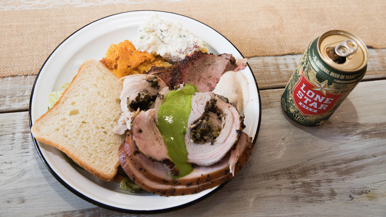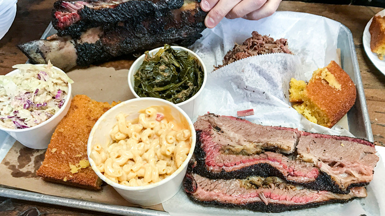Since there are so many different sides, from coleslaw to cornbread, there is seemingly no limit for what you should stack your tray with. But Rinaldi has some suggestions. Her go-to order? The aforementioned "Texas Trinity" (brisket, sausage, and ribs) with a side of corn pudding and Texas pinto beans. While her go-to beverage is Big Red, a Texas cream soda bursting with citrusy notes, she also notes that "Beer and barbecue go hand-in-hand." After all, you'll need something to wash down all that brisket, mac and cheese, and whatever other side dishes and proteins are vying for a spot on your platter.