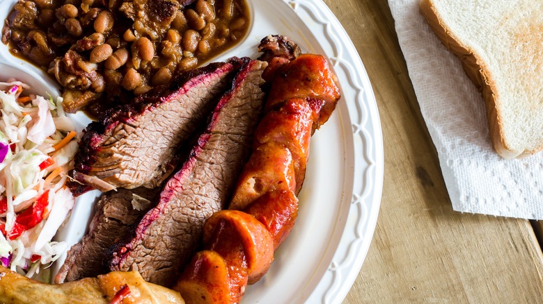 It's not just important to pair the region's barbecue sauce with a protein. You'll also have to pay attention to make sure you order the "right" protein in the first place. Every state will have a different star protein, which should be at the top of your list when it comes to ordering. "In Texas, always go with The Trinity — brisket, pork ribs, and sausage," says Sloan Rinaldi. This will give you a smattering of each type of protein that the Lone Star State's barbecue scene is famous for. Meanwhile, if you stop at a Memphis barbecue joint, you'd be remiss not to order a plate full of succulent pork ribs prepared either wet or dry. (We recommend ordering both.)