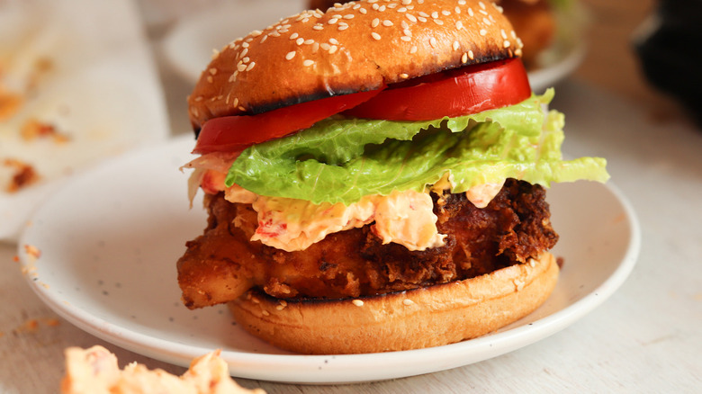 A handful of ingredients that go into the fried chicken besides the chicken breasts themselves — pickle juice for marinating, cornstarch, self-rising flour, salt, and pepper for coating, and vegetable oil for frying. Of course, there's also the homemade pimento cheese that you'll stuff into each chicken breast, which consists of mayonnaise, cream cheese, chopped pimento peppers, shredded cheddar cheese, minced onion, minced garlic, and more salt and pepper. Finally, for assembly, you'll need brioche buns, butter, romaine lettuce, and slices of tomato.