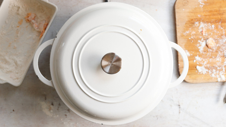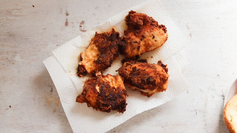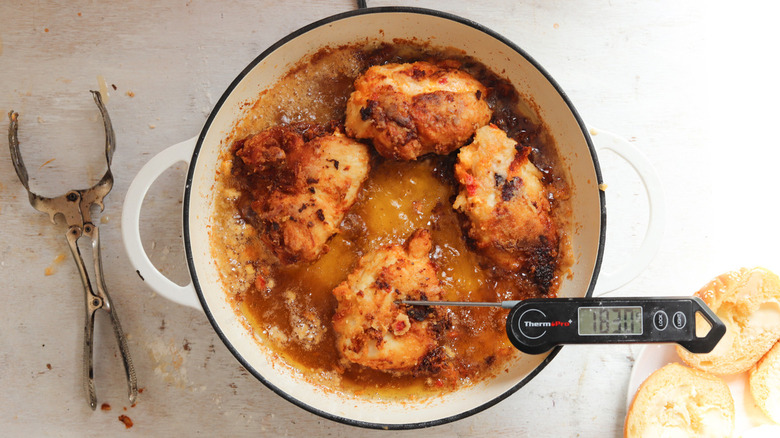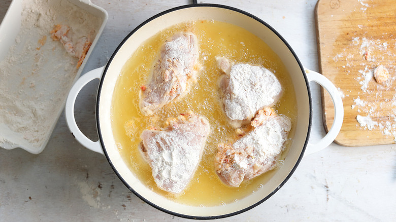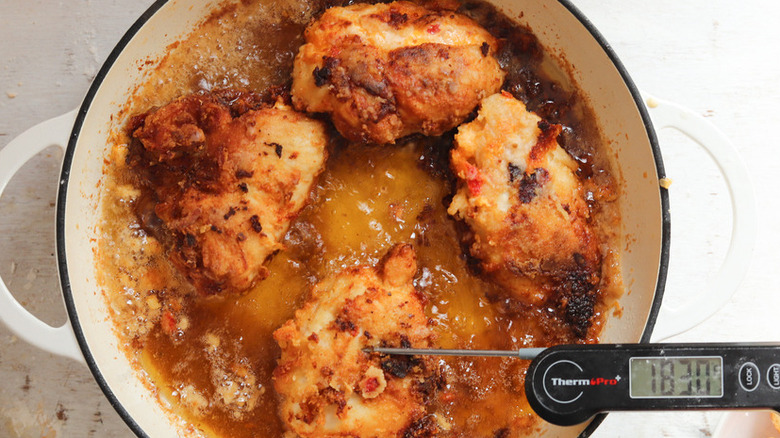 Fried chicken is something of a culinary art form and requires a certain amount of finesse to guarantee both a cooked inside and a crispy outside. While access to a temperature-controlled deep fryer certainly helps ensure perfectly crispy fried chicken (or fried anything, for that matter), not all of us are so lucky to have one readily available. So, frying chicken in a large pan, skillet, or pot does the trick, though this does leave more room for error and — worst case scenario — soggy, unappetizing chicken skin.