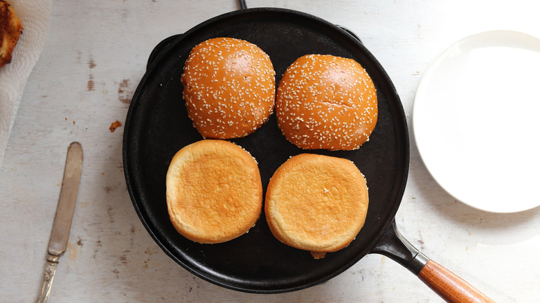 - Toast the buns on a griddle or pan until golden brown.