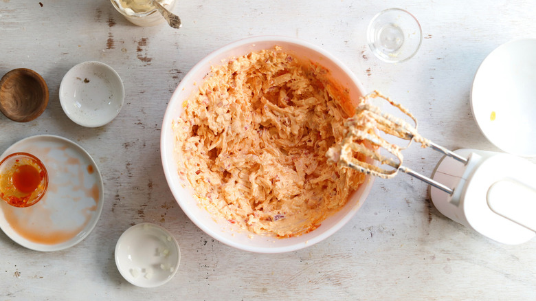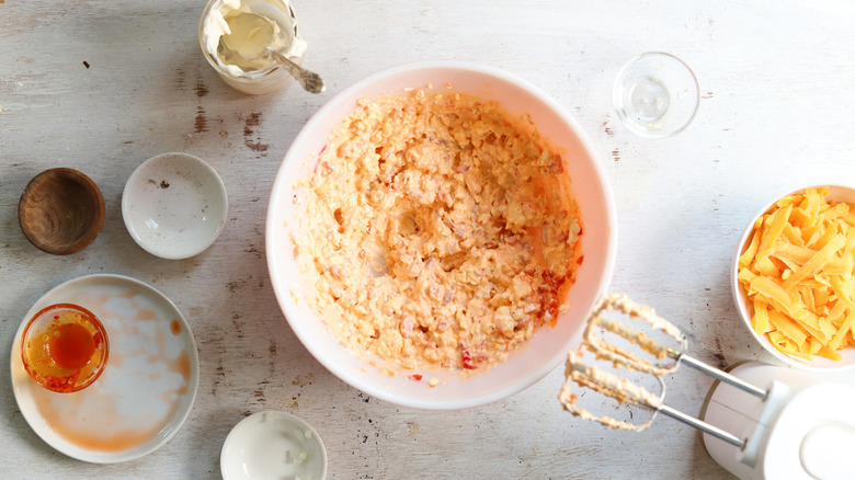 Maroney notes that a good way to enhance the spice level of this pimento cheese is by way of jalapeño, which will definitely make the mix spicier while adding a subtle crunch. "Green onions are a great substitution for onions," she says. "Chopped crispy bacon is also a great mix in." Do you prefer more tangy flavor profiles? If so, you can elevate your pimento cheese by adding Worcestershire sauce, diced pickles, Dijon mustard, and/or lemon juice. And, if you absolutely don't feel like whipping up your own batch of the cheesy stuff, you can easily buy a store-bought pimento cheese spread and use that instead.
