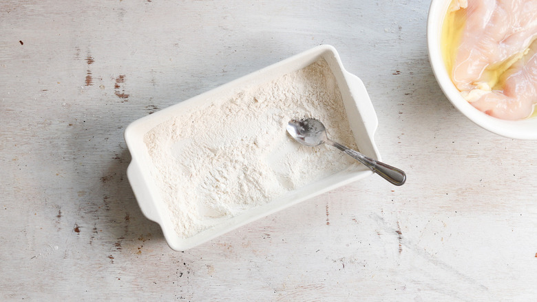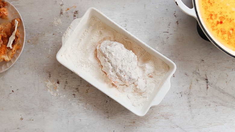 Step 7: Coat the chicken in the flour dredge