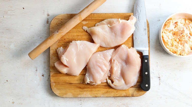 Cut each chicken breast into two equal-sized pieces. Then, split each one with a butterfly cut.