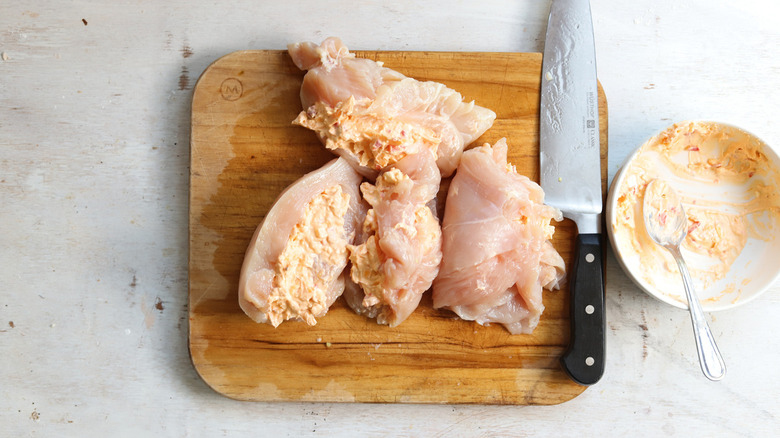 - Split the pimento cheese mixture in half and stuff each chicken piece with a few tablespoons of the mixture. Reserve the other half of the mixture for topping.