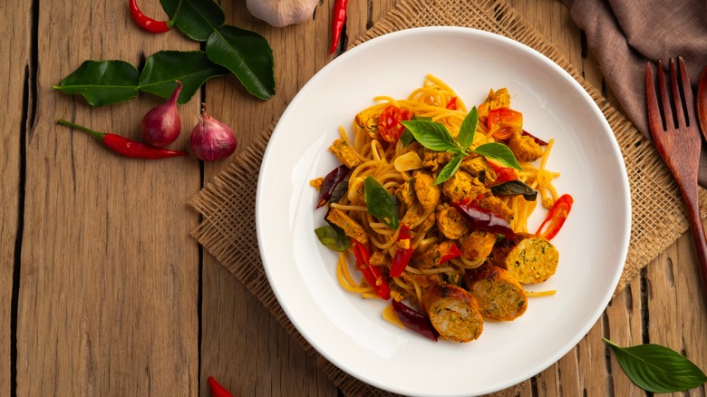 The go-to pasta for a lot of stir-fries is spaghetti, and it's easy to see why; it's agreeable in terms of shape and in flavor, and it kind of resembles the chow mein noodles you'd find in your Asian takeout meal. But, that doesn't mean the only shape you have room to experiment with is boring spaghetti. Other types of pasta shapes are also well-suited to grabbing onto all that sauce. For one, bucatini has a hole running down through the center, which increases its surface area and ability to hold onto a homemade teriyaki sauce. If you make a ton of macaroni and cheese in your house, you may also have some elbow pasta or cavatappi lying around. If you use these shorter pasta shapes, just be wary that they may not be as conducive to eating with chopsticks as a longer, thinner noodle.
