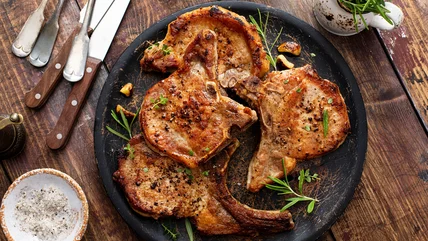 When you're ready to roll, remove your pork chops from the brine. There's no need to rinse – patting them dry with paper towel will remove any excess liquid and help you achieve a good sear. These chops will be tasty enough pan fried and served with your favorite sides, but are also great to use as the meat to upgrade other pork chop recipes.