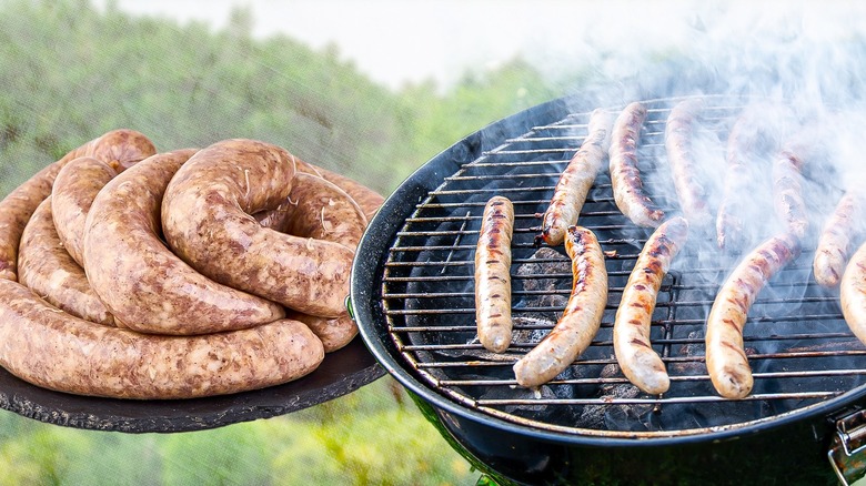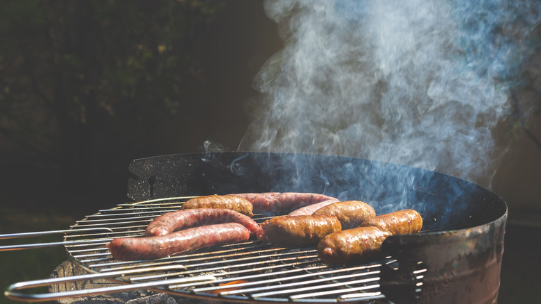 Brad Wise agrees with this. He suggests cooking the sausages "low and slow" over indirect heat. "Direct heat is going to burst the casing, which means you're going to lose all the juices and end up with a dry sausage." Using the two-zone grilling method will give you better control over the color and cook on your sausages. This method is easy to implement on both charcoal and gas grills. For the former, turn one burner on and leave the other one off. And for charcoal, just stack the briquettes on one side.