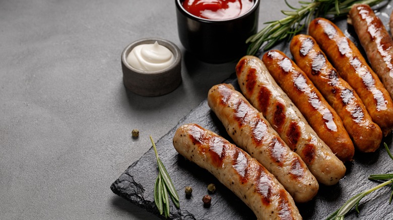 It can be difficult to decide when to pull your sausages off the grill. They might look done, but the only real way to tell if your sausages are not only safe to eat but also perfectly cooked all the way through is to use an instant-read thermometer. "The internal temperature should reach 160 degrees Fahrenheit for pork sausages or 165 degrees Fahrenheit for chicken sausages," says Grace Vallo. And yes, before you ask — it is possible to make an Italian-style chicken sausage.