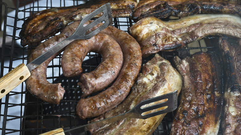 Many folks will pre-cook their sausages before placing them on the grill. This method will help you better control the cook on your links; if you cook the sausages the whole time on the grill, you may risk drying them out. But, if you just toss them on for the last few minutes of the cooking time, you can get the sear that you're craving. Moreover, you'll want to be sure that pre-cooked sausages are being thrown onto a preheated grill, per Vallo's suggestion, to ensure that they get the perfect crisp coating rather than just overcook.